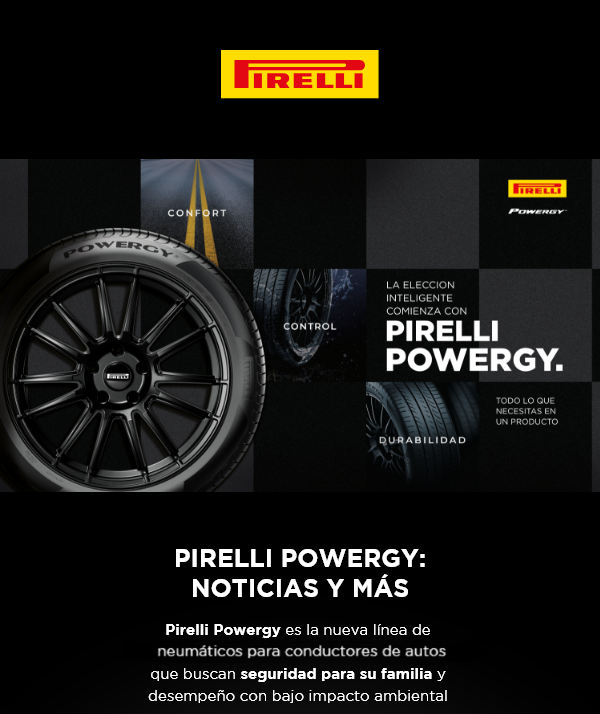 Pirelli POWERGY representa la opción inteligente para conductores que buscan seguridad y performance con bajo impacto ambiental. Gracias a que fué desarrollado con las más sofisticadas tecnologías, su diseño ha permitido optimizar varios aspectos claves para el comportamiento de un neumático premium, tales como mejor el contacto con el asfalto, menor resistencia a la rodadura, mayor eficiencia de combustible, mejor distancia de frenado y un excelente comportamiento en superficies mojadas.